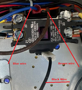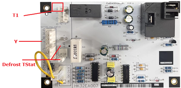 The two images below shows a board with the T1 terminal on it so you can see the locations of this specific board. In the picture on the right, you can see it is mis-wired. The blue needs to be on the other side of the contactor coil.