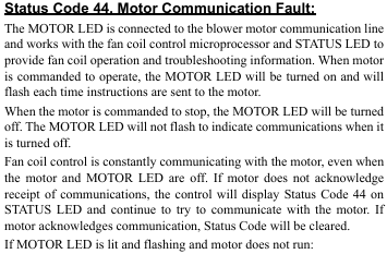 The explanation is actually very simple. Fault code 44 indicates a blower motor communication fault. This means the fan coil control board is unable to communicate with the blower motor.